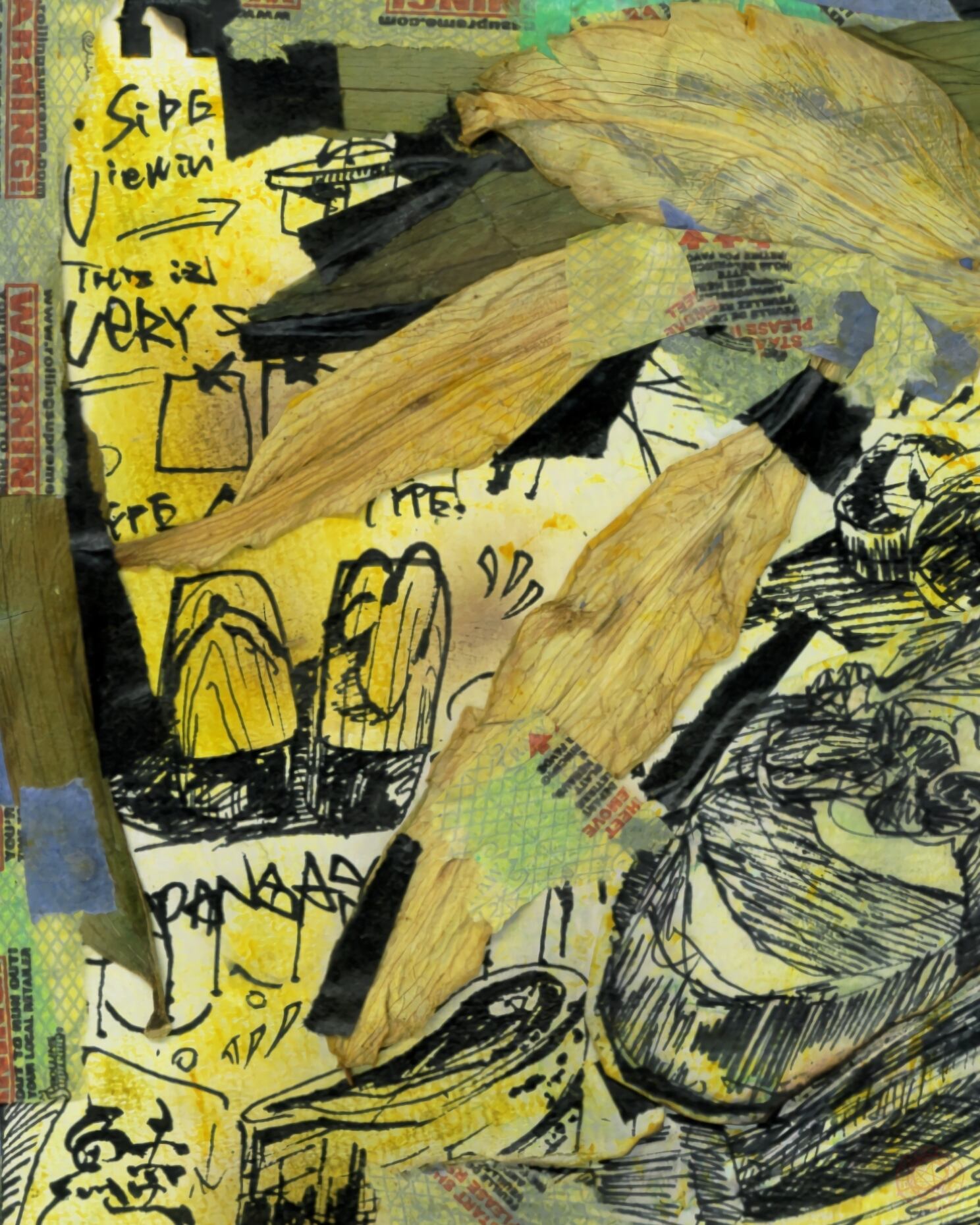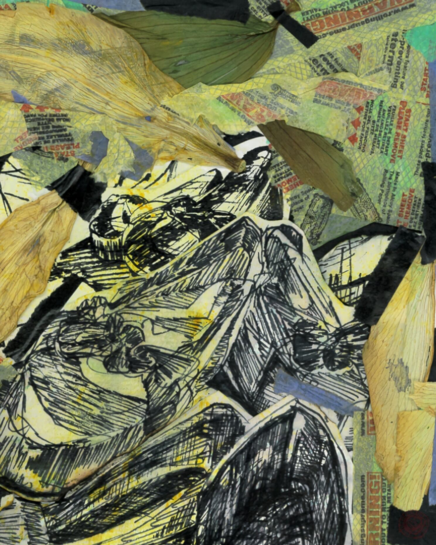 画用紙にペンやコラージュ、フィキサチフ(定着剤)