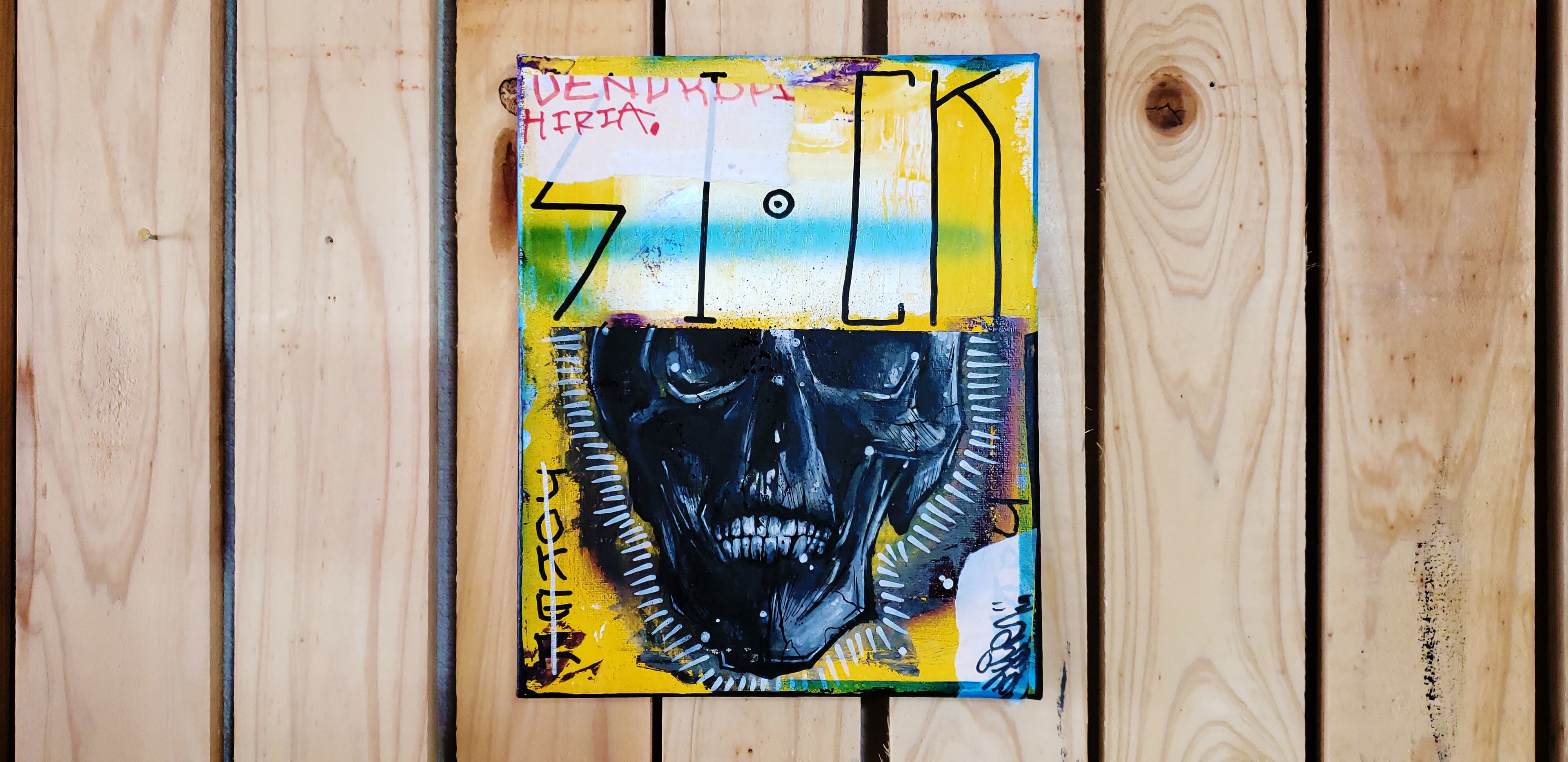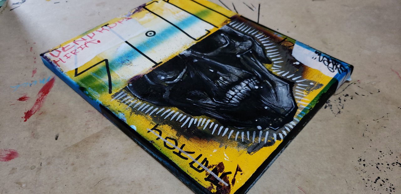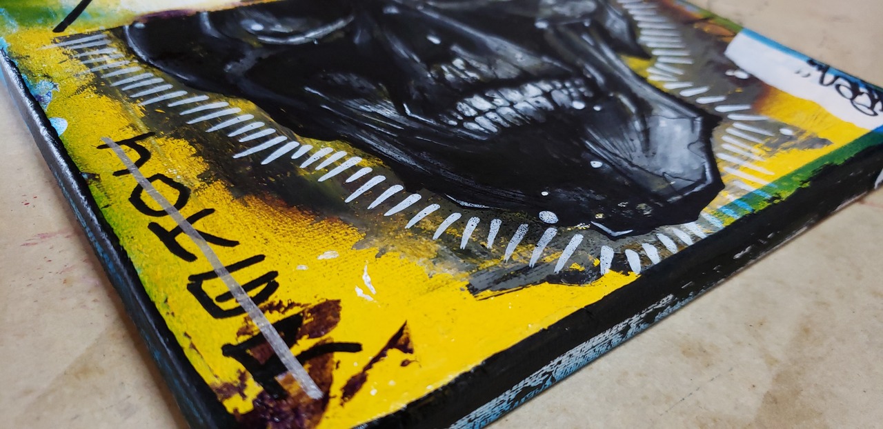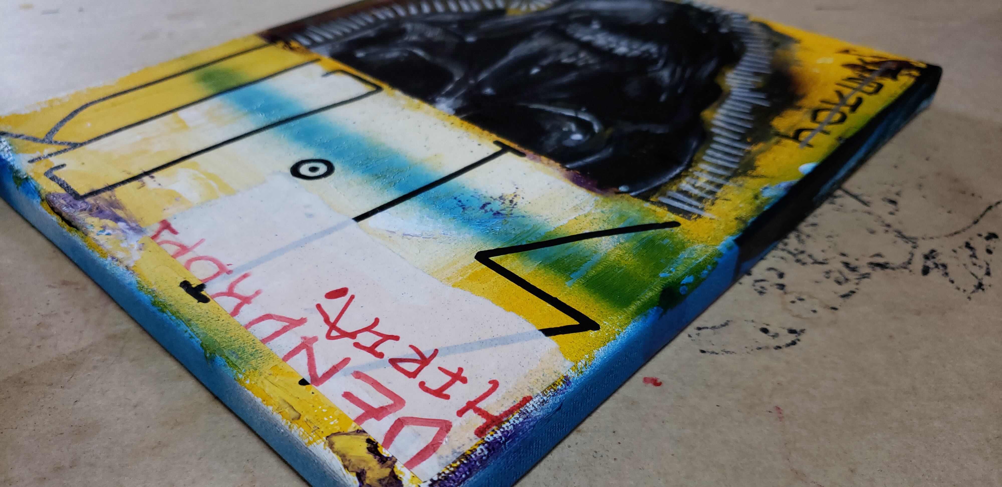 カンバスにポスターカラー、アクリルガッシュ、アクリル性スプレーインキ