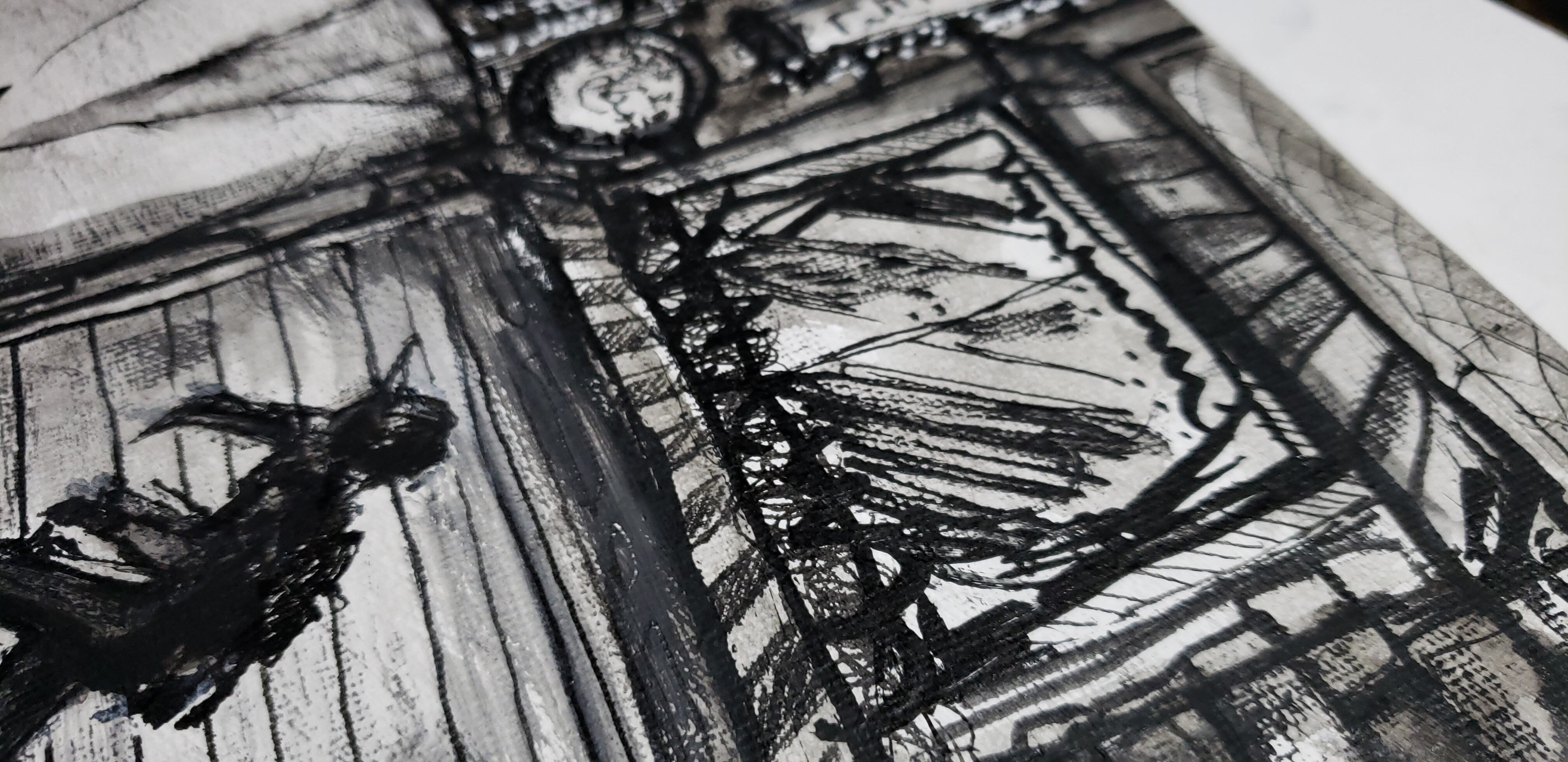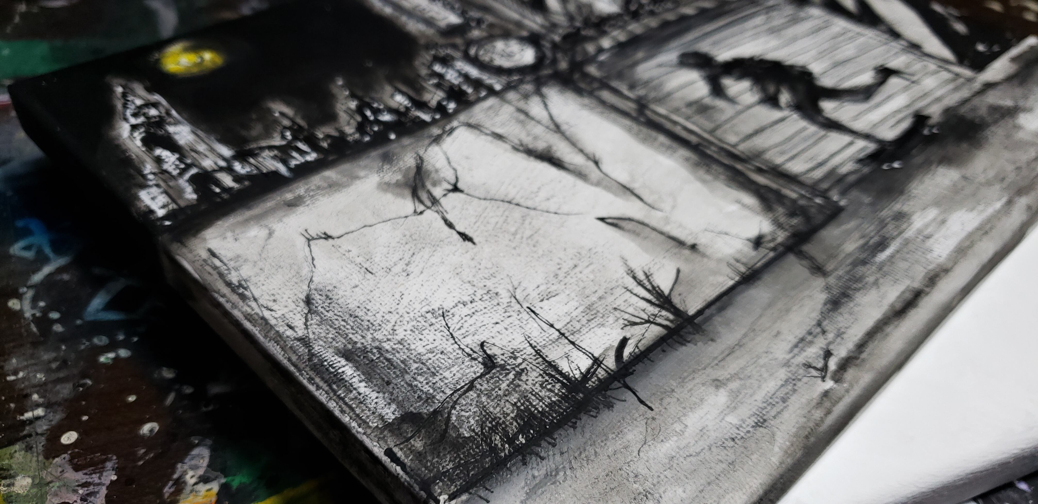 カンバスにポスターカラー、アクリルガッシュ、アクリル性スプレーインキ