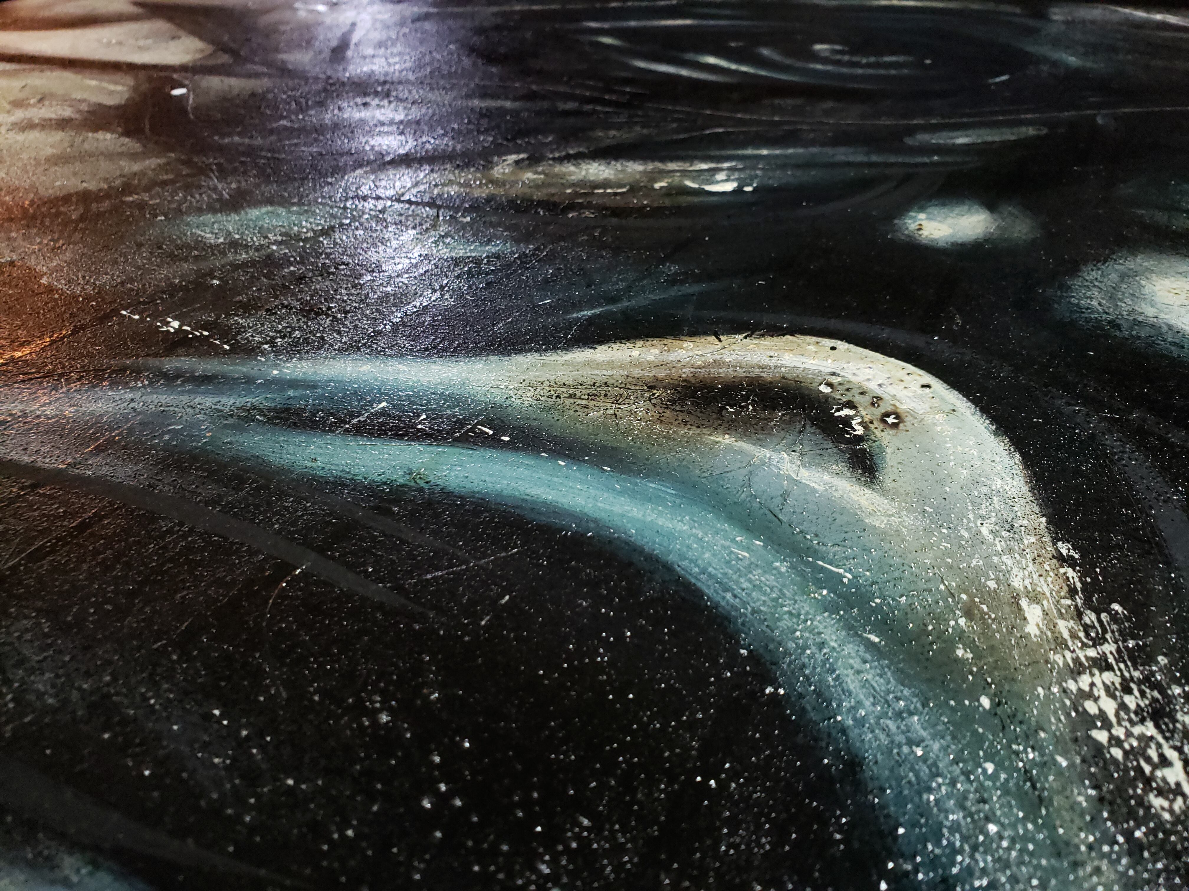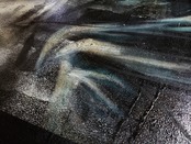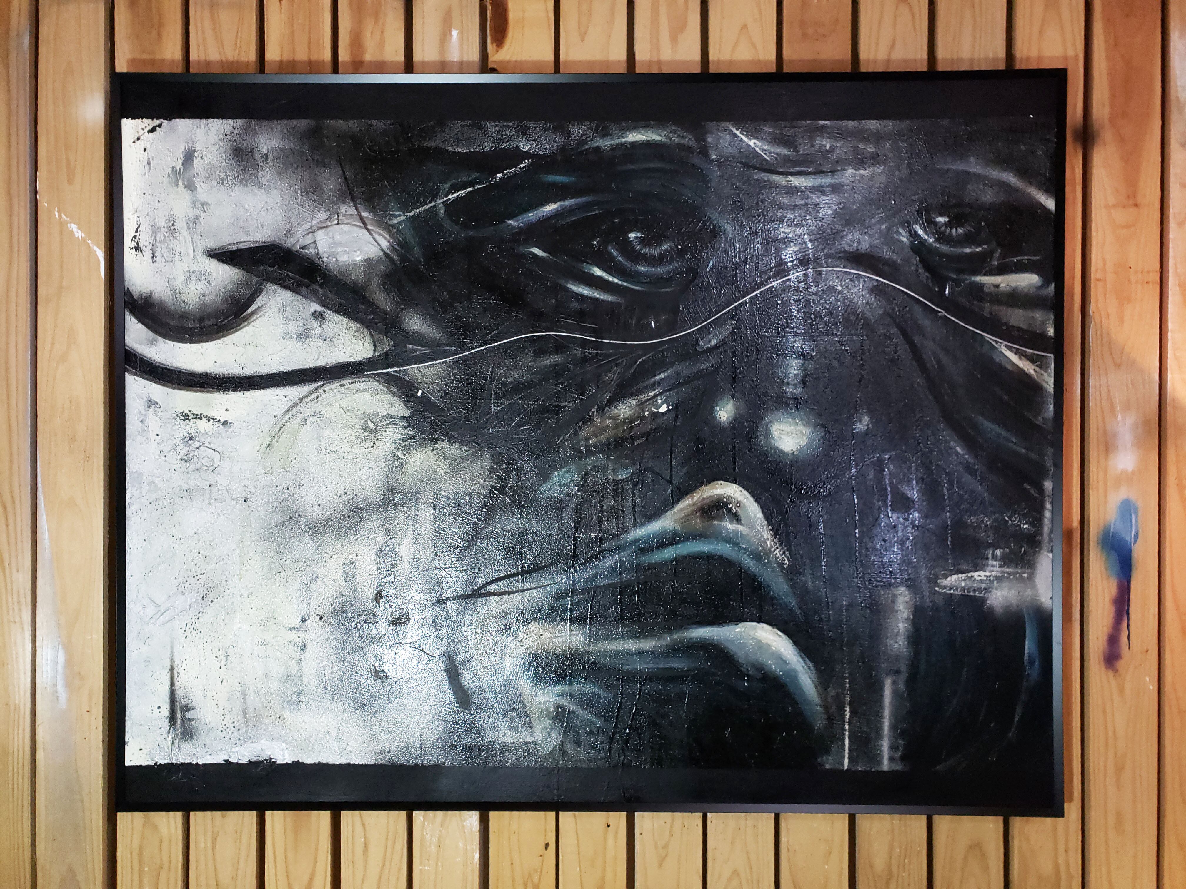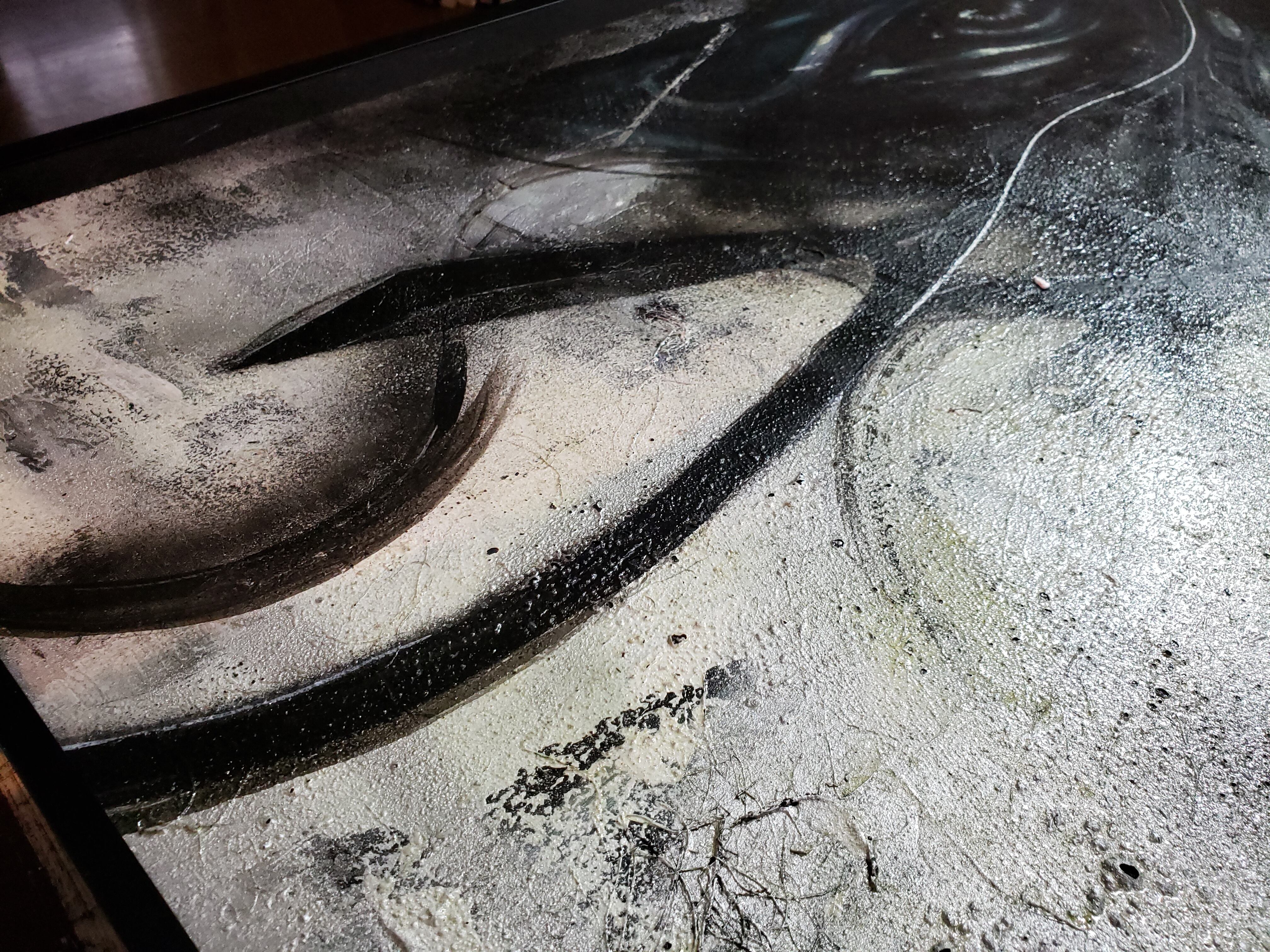 カンバスにジェッソ、油絵具、ガスバーナー、木炭、ペン