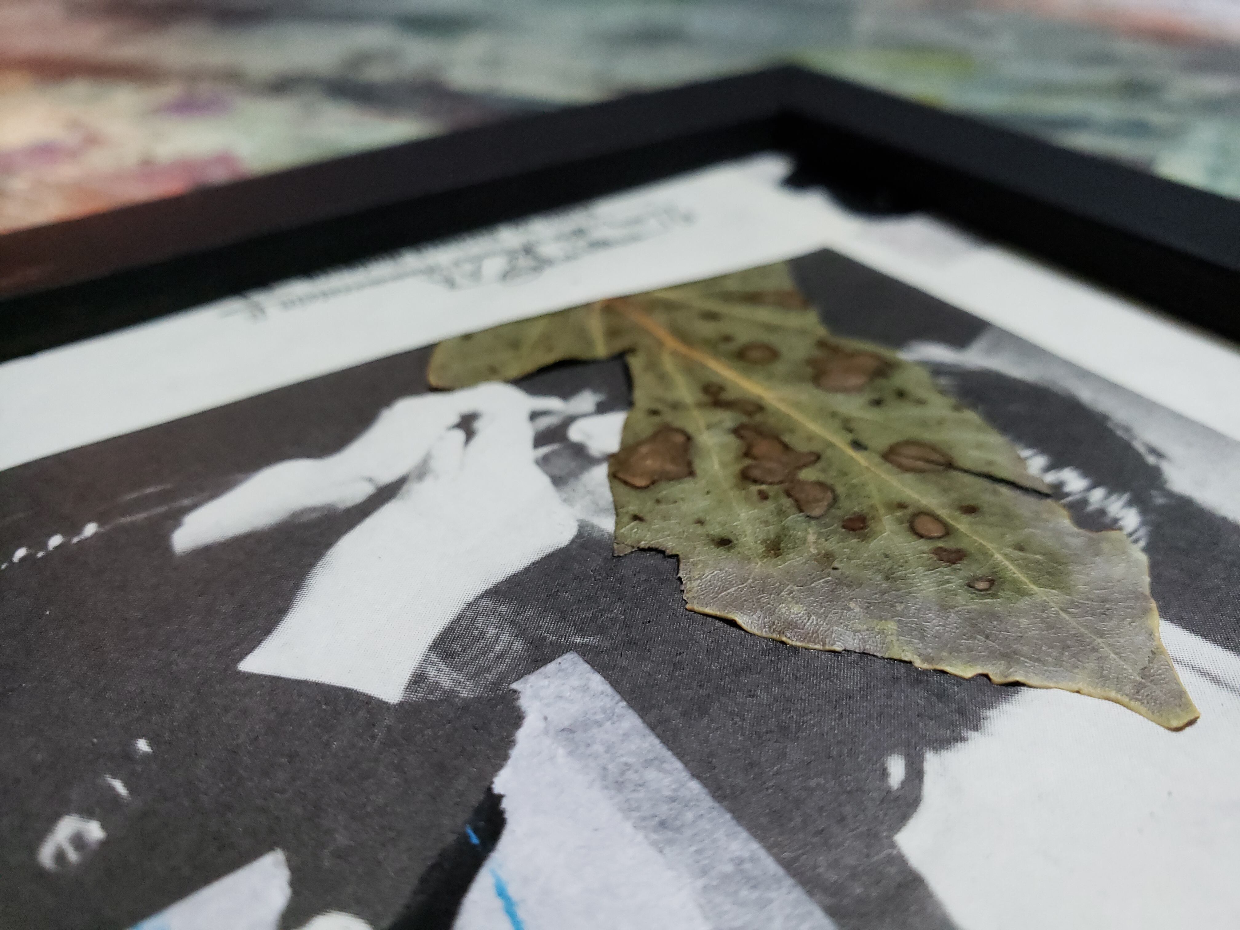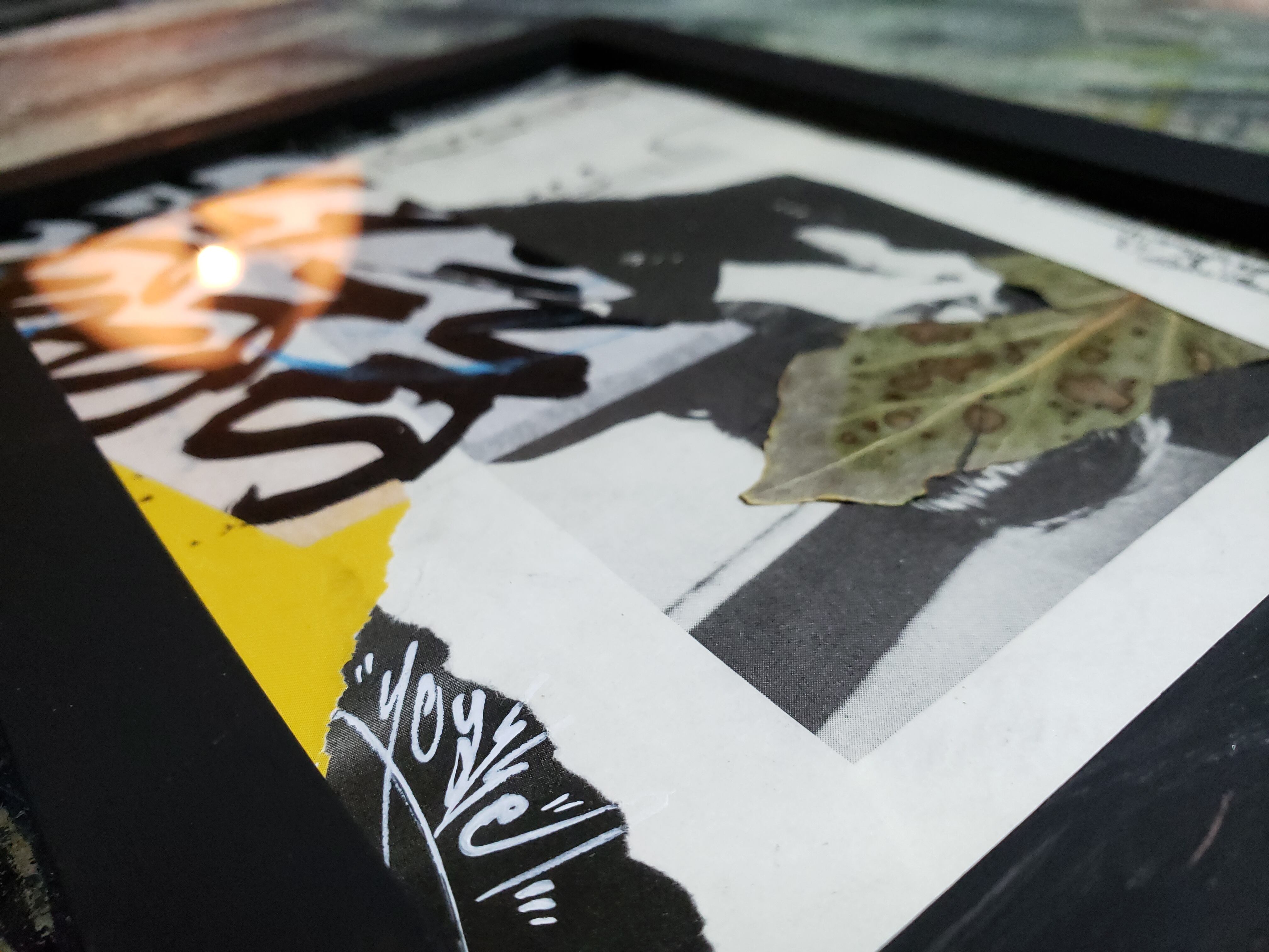 画用紙に貼り紙、落ち葉、楽譜、ステッカー、ペン