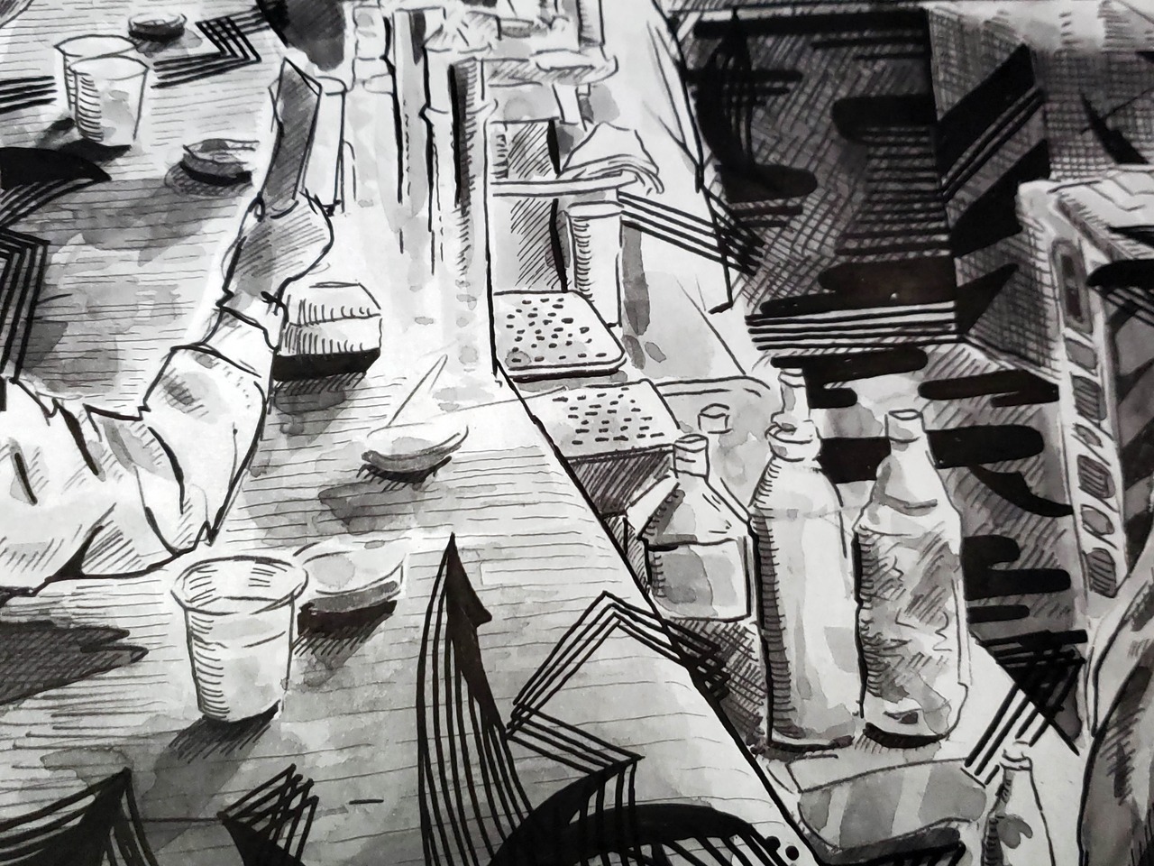 画用紙にペン、水墨